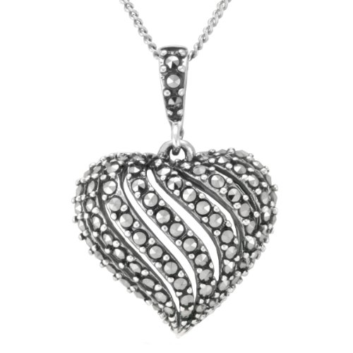 A classic heart pendant receives a modern look with the Sterling Silver Marcasite Open Work Heart Pendant Necklace. Resting on a delicate curb chain lays a gorgeous open work heart shape. Swirls of metallic marcasite studs fill the pendant to create the perfect combination of elegance and edge. The hand-set stones sparkle in any light. Just around an inch in size, this pendant makes a sparkly statement on any neckline. Makes a great gift for the fashionista in your life.Available at Amazon Check Price Now!